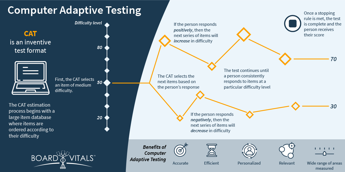 To simulate actual NCLEX exam conditions, our question banks are equipped with CAT technology. Users can create a CAT practice exam to provide a sense of the style and difficulty of the exam at an individualized level. Every time a user answers a question correctly, subsequent questions will increase in difficulty until a question is answered incorrectly. Similarly, questions will get easier as more questions are answered incorrectly.