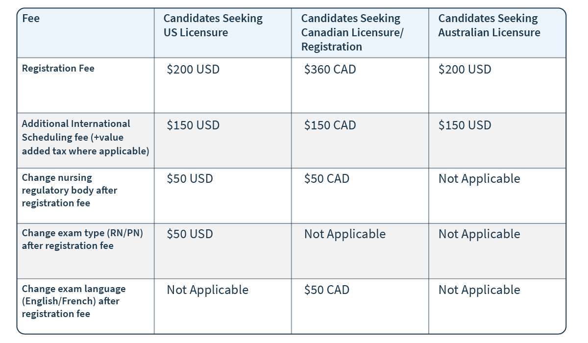 Associated exam registration fees are collected during the NCLEX registration process. Depending on the candidate’s needs, additional fees may apply.