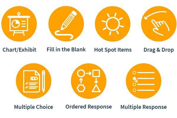 There are many types of questions that can appear on the NCLEX exam. Our question banks include every question format found on the actual exam to help candidates feel confident they are prepared walking in on exam day. Various forms of NCLEX questions include: